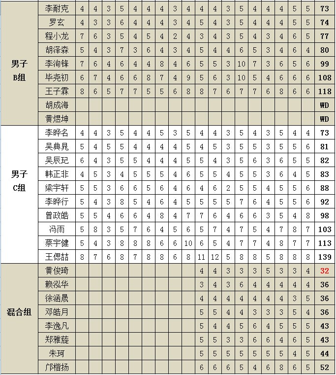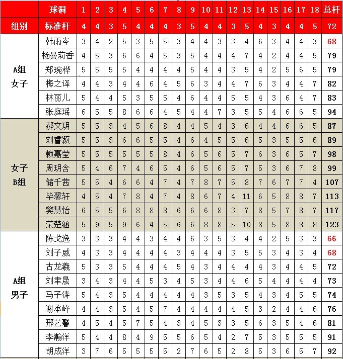 获得各组冠军的选手分别是:韩雨岑(68杆,女子A组)、陈戈逸(66杆,男子A组)、郝文玥(87杆,女子B组)、李耐克(73杆,男子B组)、李晔名(73杆,男子C组)、黄骏琦(32杆,9洞混合组)。