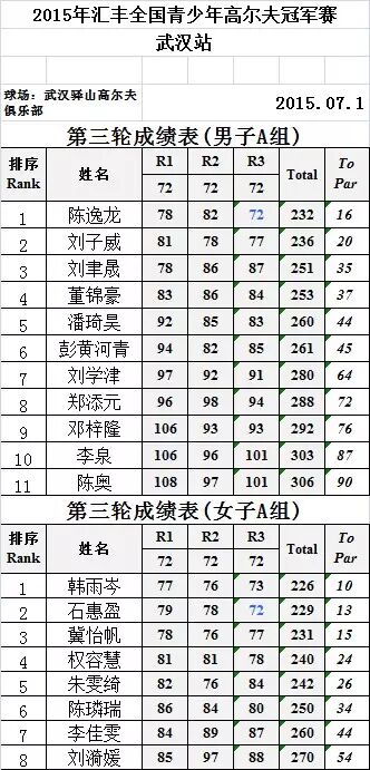 在汇丰全国青少年高尔夫冠军赛武汉站的比赛中,获得各组冠军的选手分别是:陈逸龙(男子A组)、韩雨岑(女子A组)、王炎彰(男子B组)、杨曼莉香(女子B组)、熊瑞珩(男子C组)、陈钰琳(女子C组)、李里罡(男子D组)、龚昶文(女子D组)、徐佳程(男子E组)以及吴霁月(女子E组)。其中,陈逸龙、王炎彰、徐佳程、陈钰琳、龚昶文和吴霁月都实现了各自的突破,首度尝到了汇丰全国青少年高尔夫冠军赛的胜利滋味。