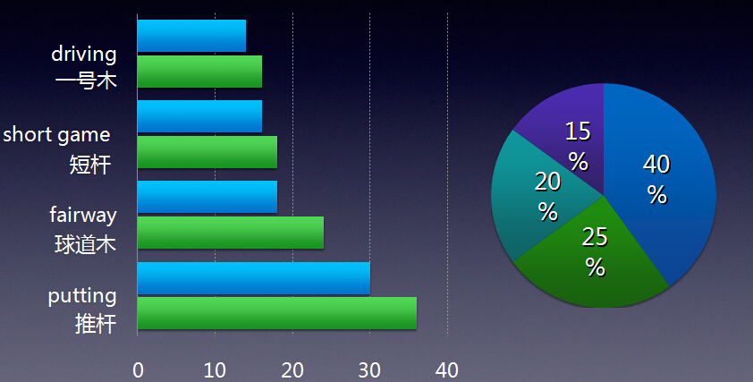 学习高尔夫经常听到的一句话就是“Quality is more important than quantity”(质量重于数量)。做什么事情都要讲究效率和方法,这远比毫无头绪、漫无目标的乱打一通要有效地多。究竟是要事半功倍还是事倍功半,可能就在于一个观念或是方法的区别之上。那些打职业冠军的球手,其过人之处,往往也就藏在其勤奋的态度和聪明的训练方法里。