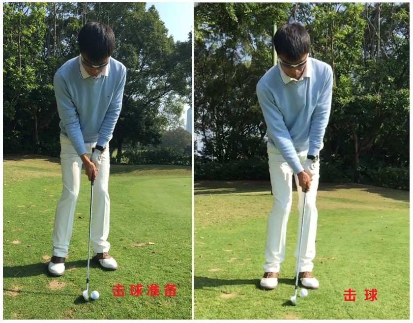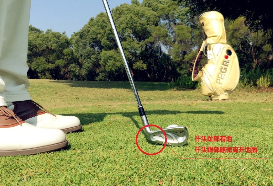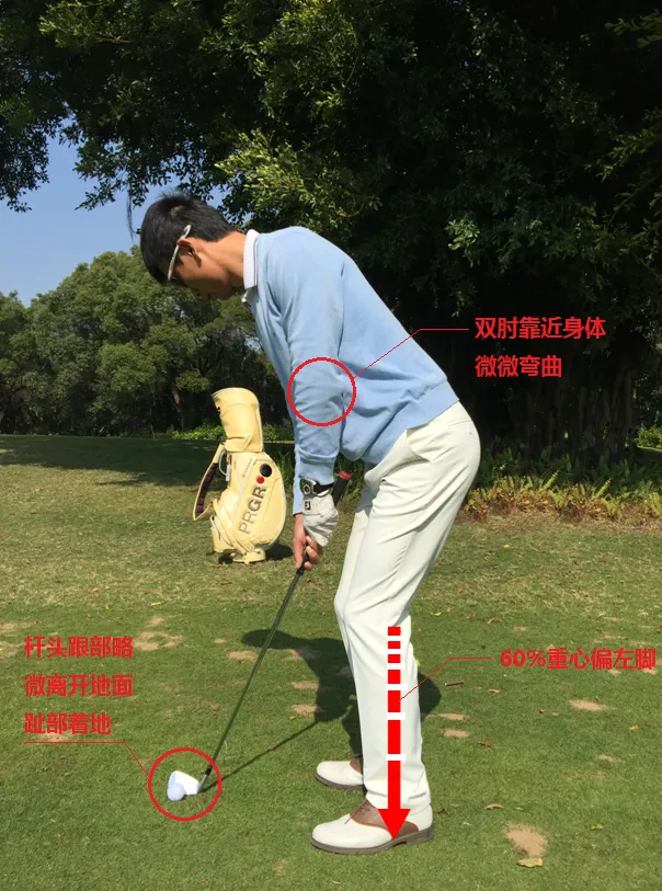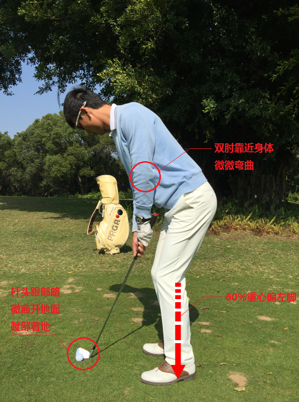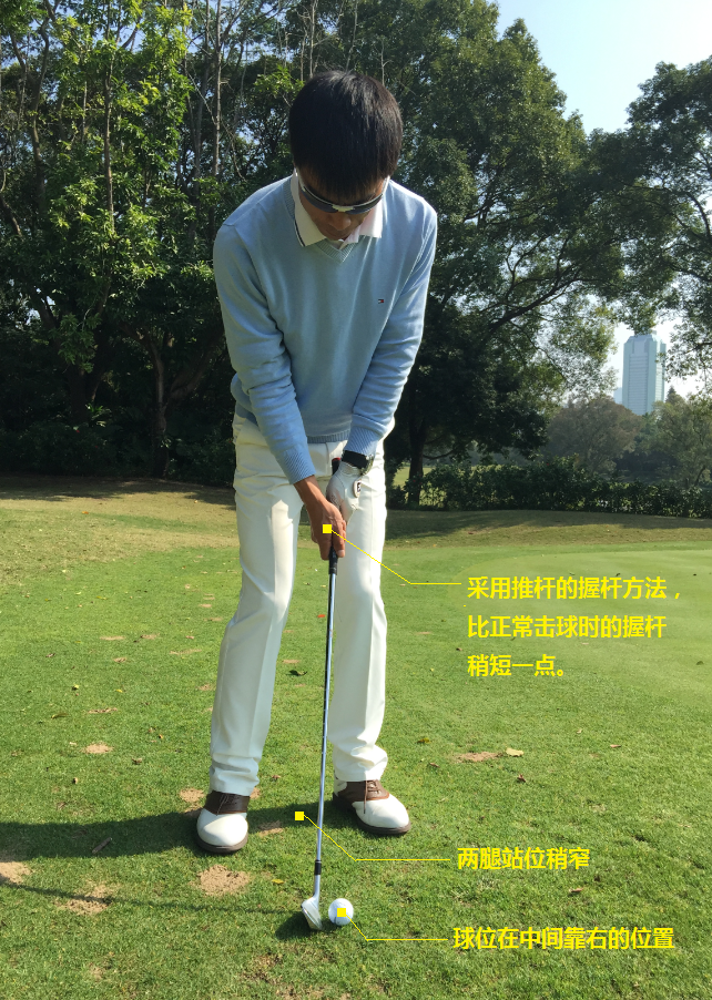 1、首先以P杆为例,握杆要采取推杆的握杆方法,握杆的时候比正常击球时的握杆稍短一点,手腕稍微提起,双肘靠近身体微微弯曲,类似推杆动作。球的位置放在中间靠右的位置,两腿站位稍窄,重心偏左脚60%左右。