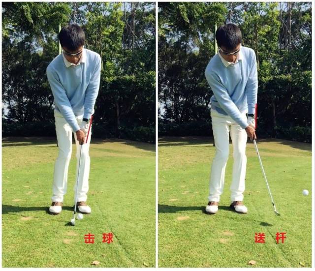 4、依靠肩膀转动力量带动身体,应确保在触球过程中由双手引领杆头运动将球击出去,击球瞬间手腕保持不动,这样左手腕背面将保持平坦,使杆面干脆利落地触球。